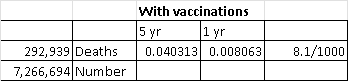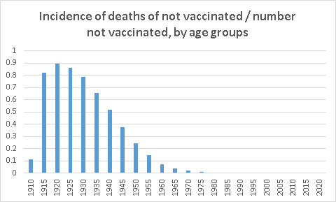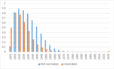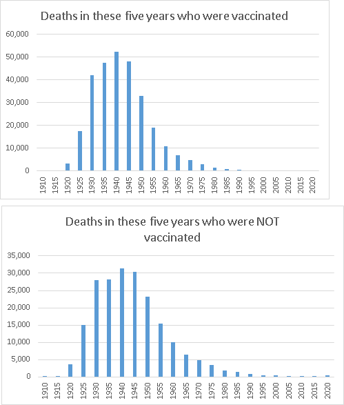 Vaccinated, and not vaccinated deaths in five year period, by birth year in 5 year bins: