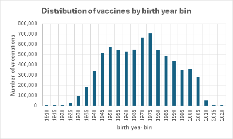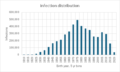 It’s also interesting to note how it overwhelmingly affected those in the older age groups, especially in birth bins1925 - 1930, 1930 -1935, and 1935 - 1940.3 The infection distribution (tested rather than all known and unknown infections, by the way) that the above is based on looks like this: